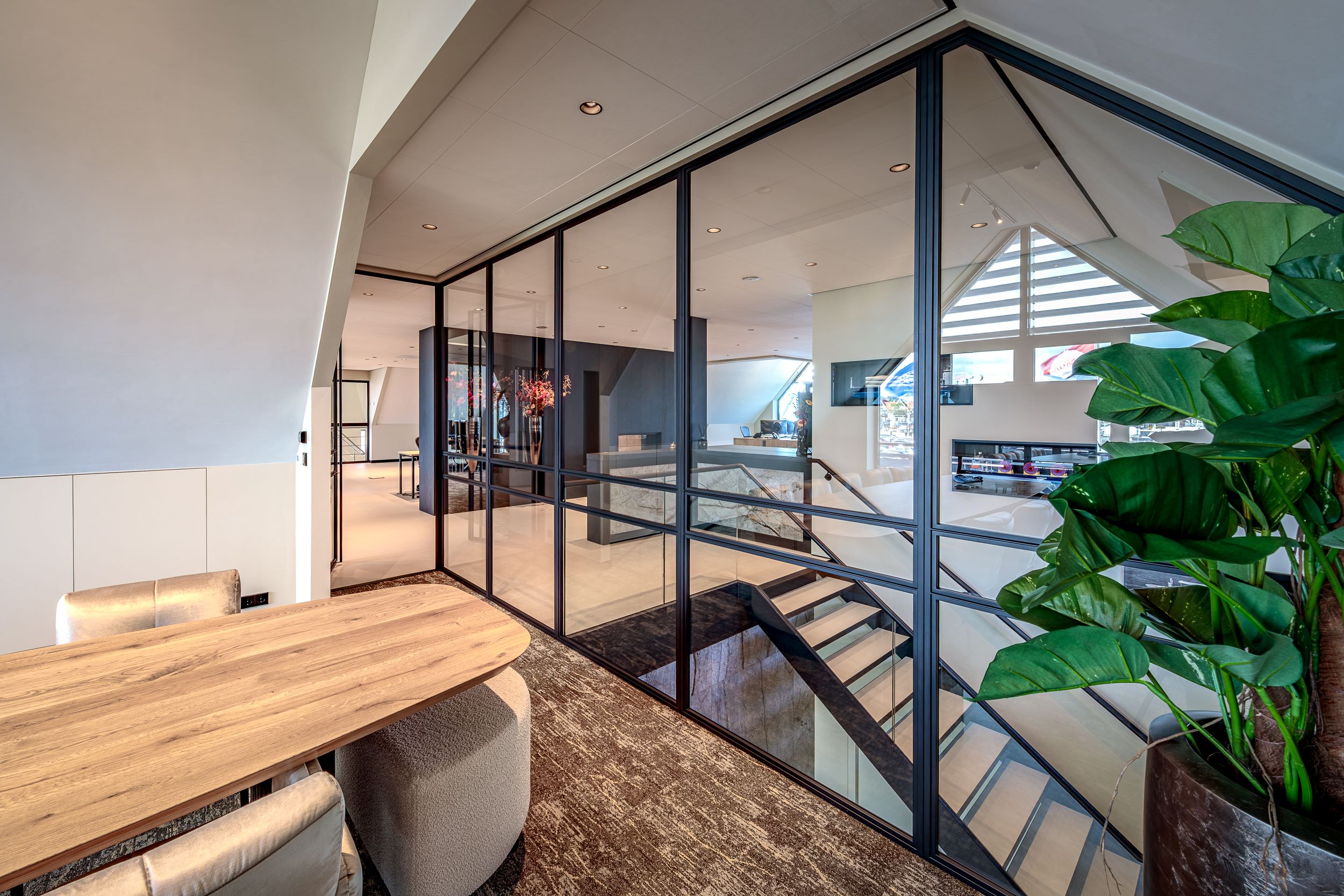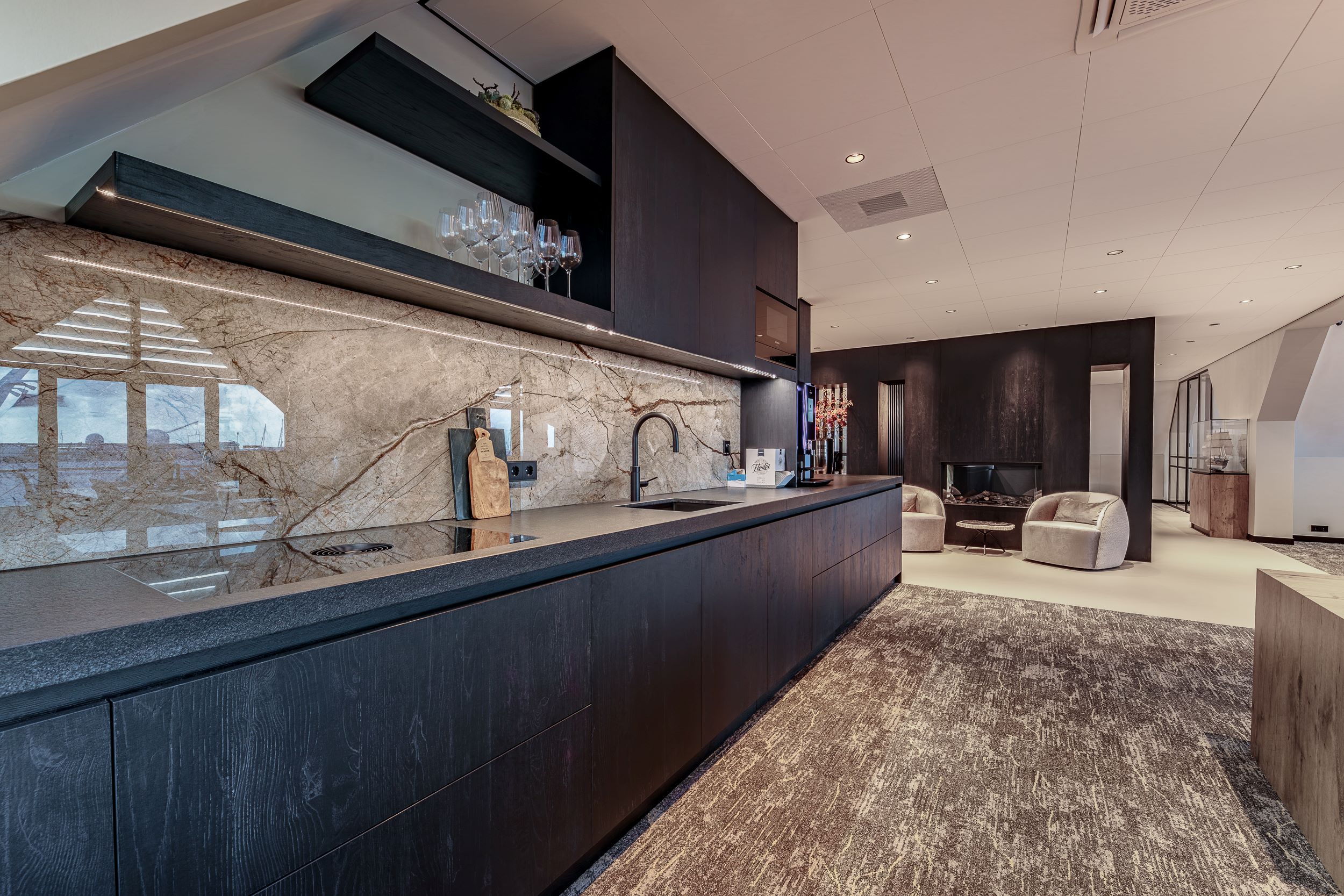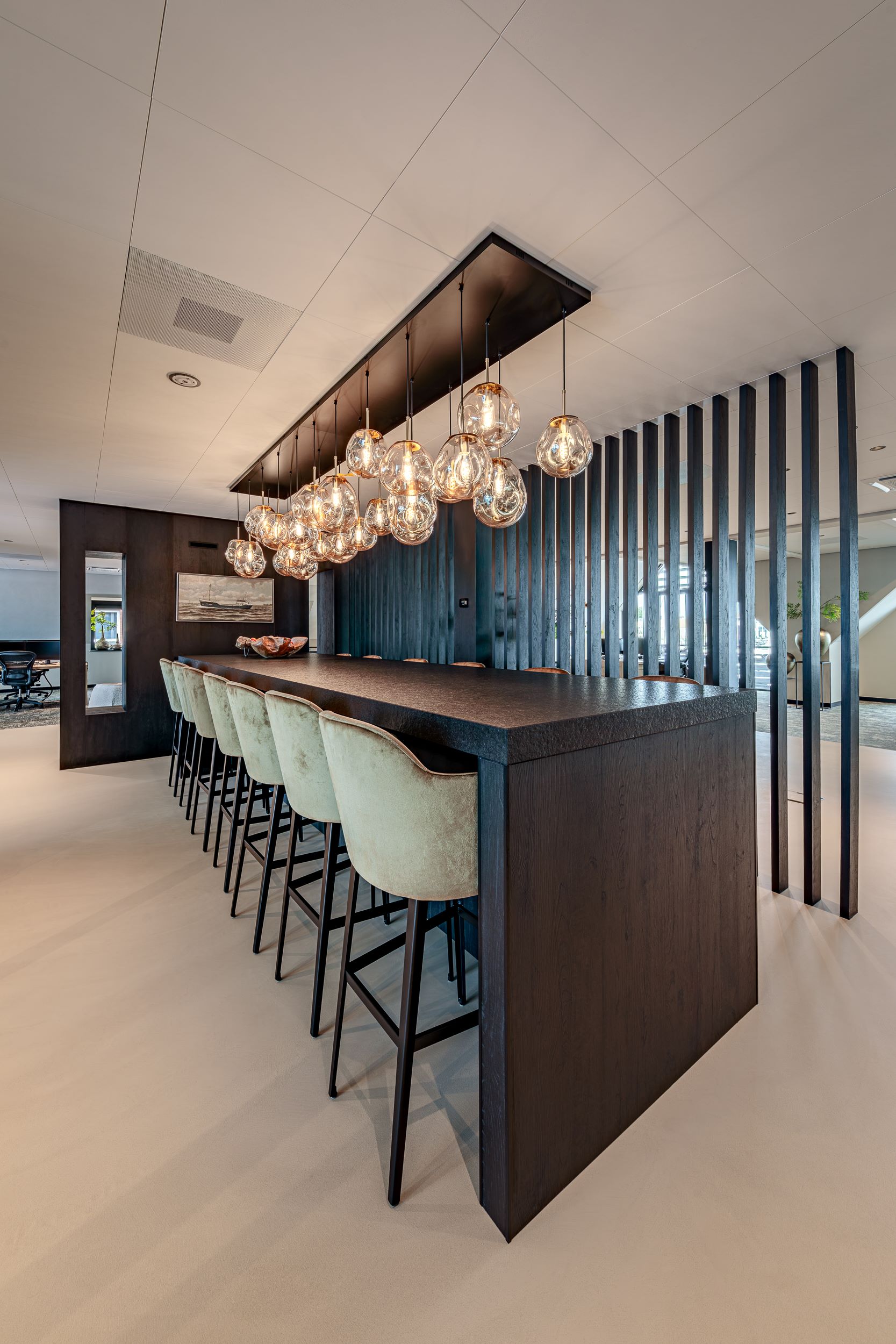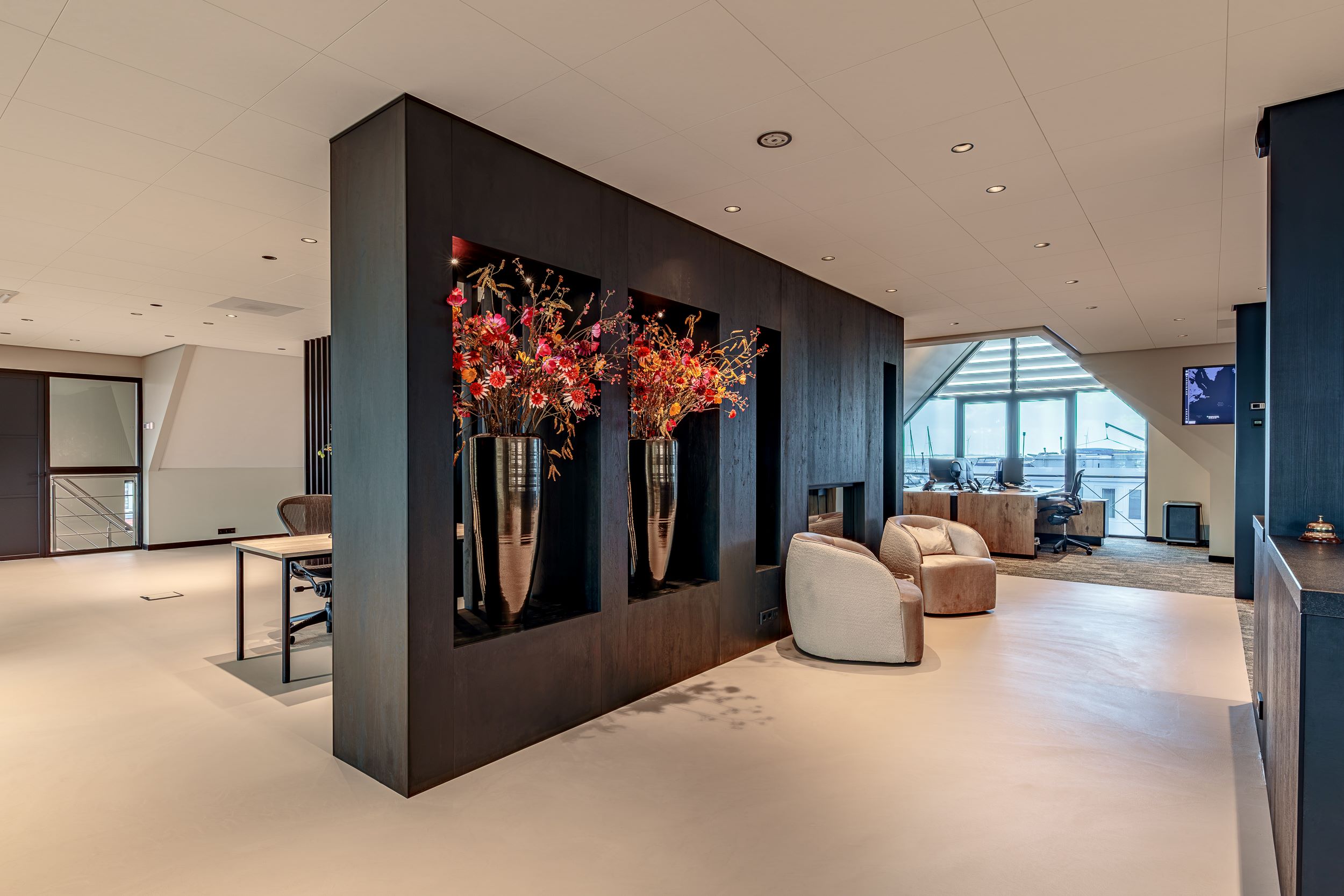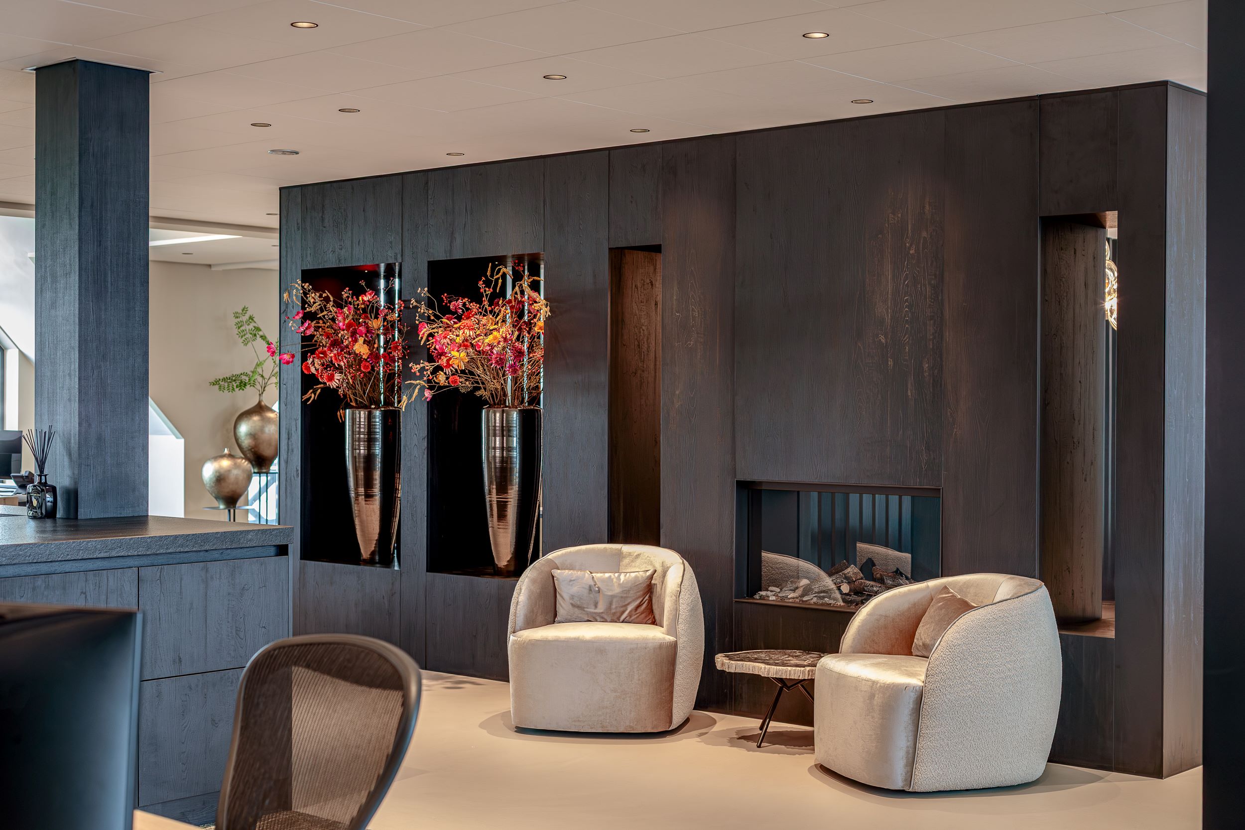 Het resultaat is een ruimte die zowel representatief als sfeervol is. Bezoekers ervaren direct de luxe en warmte, terwijl het interieur functioneel en comfortabel blijft. Elk element – van plafond tot wand – draagt bij aan een harmonieus geheel waarin esthetiek en gebruiksgemak elkaar versterken.