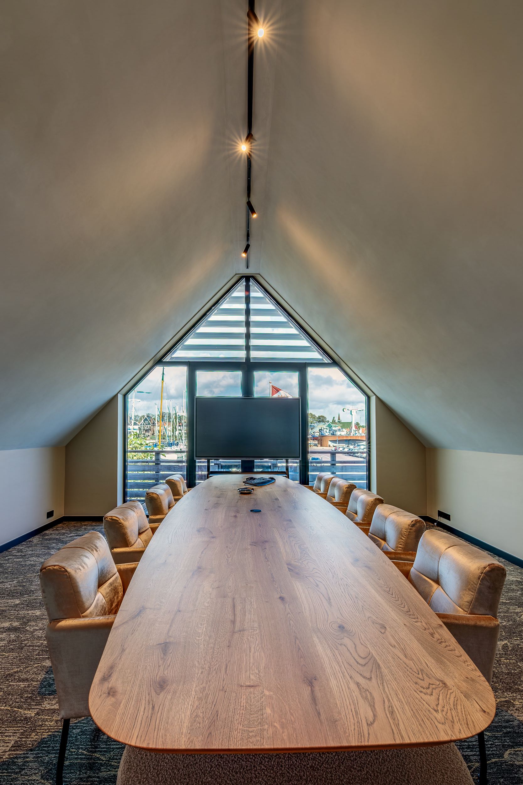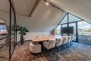 Op de schuine plafonds is een naadloos akoestisch stucplafond aangebracht, waarin design en geluidsabsorptie samenkomen. Voor dit project is gekozen voor het @Ecophon Fade™ systeem, dat zorgt voor optimale geluidsbeheersing en tegelijkertijd een elegante uitstraling biedt.